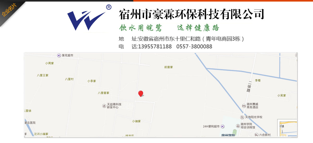 - 宿州市豪霖環(huán)保科技有限公司專(zhuān)業(yè)致力于水處理產(chǎn)品和系統(tǒng)水處理工程,集產(chǎn)品的開(kāi)發(fā)與銷(xiāo)售、工程配套與安裝、技術(shù)咨詢(xún)與服務(wù)于一體的新型環(huán)保企業(yè)。主營(yíng)產(chǎn)品:家用、商用純水機(jī)系列,能量活水機(jī)系列,家用、中央用凈水器系列,管線(xiàn)機(jī),泵、膜系列,各種零配件、水處理耗材等配套產(chǎn)品系列,循環(huán)冷卻水處理系統(tǒng),鍋爐軟化水處理系統(tǒng),海水、苦咸水淡化、污水處理系統(tǒng),軟化及過(guò)濾裝備,紫外線(xiàn)及臭氧消毒設(shè)備等全部產(chǎn)品。